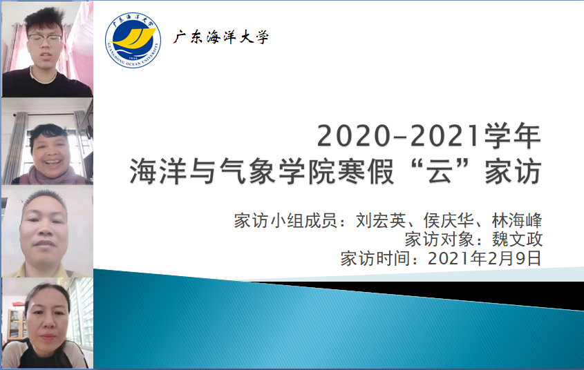 在线上“云”家访过程中,学院党委刘书记、辅导员和班主任与学生和家长通过视频连线进行亲切交谈,向家长和学生们宣传国家资助政策,传递学校和学院对学生的关心,反馈学生在校学习和表现情况,重点了解同学们在家期间的学习、生活、假期计划和家庭情况,学院党委刘书记勉励同学们要自立自强、矢志奋斗,以优异的成绩回报家庭和社会。受访家长及学生们表示,寒冬时节,学院通过线上“云”家访送来了温暖,非常感谢学院关爱,一定心怀感恩,努力学习,积极进取,通过知识来改变命运。