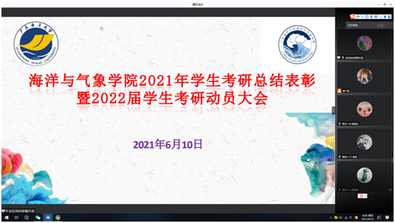 在腾讯会议室召开2021年学生考研总结表彰暨2022届学生考研动员大会,学院党委书记陈晓,院长谢玲玲,副书记刘宏英,副院长陈法锦、郑少军和系领导、班主任、辅导员以及各年级有考研意向的学生和考研录取学生150多人参加了会议。会议由刘宏英主持。