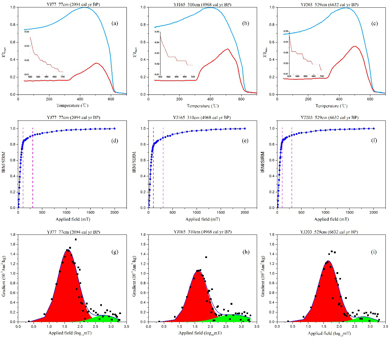 我院海洋地质团队成员黄超利用采自南海北部大陆架粤西泥质区的YJ Core岩芯做为研究对象(图1),通过210Pb和AMS 14C两种测年方法建立YJ Core岩芯的年龄–深度模式,开展系统的环境磁学研究工作,分析研究区沉积物的磁性参数的变化特征,并探讨研究区沉积物磁性特征的环境意义。该研究获取了研究区域过去7500年以来的高分辨环境磁学记录。研究表明YJ Core岩芯沉积物中的磁性矿物为碎屑成因,磁性矿物主要是磁铁矿,同时也含有少量的赤铁矿(图2)。YJ Core岩芯沉积物中磁性特征对气候变化响应灵敏,记录了过去7500年以来东亚夏季风的演变历史(图3)。7500–6800 cal yr BP期间,成壤作用的环境磁学χARM/χ和χARM/SIRM比值都依然保持相对较高的值,反映强盛的东亚夏季风;6800–3500 cal yr BP期间,磁性矿物含量指标ARM和磁性矿物粒度指标χARM/χ和χARM/SIRM的含量相对较高,可能反映相对湿润的气候,进而可能指示该时期相对强盛的东亚夏季风;3500–2000 cal yr BP期间,ARM和χARM/χ和χARM/SIRM相对较低,表明东亚夏季风相对较弱;近2000年以来,由于人类活动逐渐增强,YJ Core岩芯沉积物环境磁学指标可能不仅仅受气候变化的控制,而且可能主要受到日益增强的人类活动的影响。