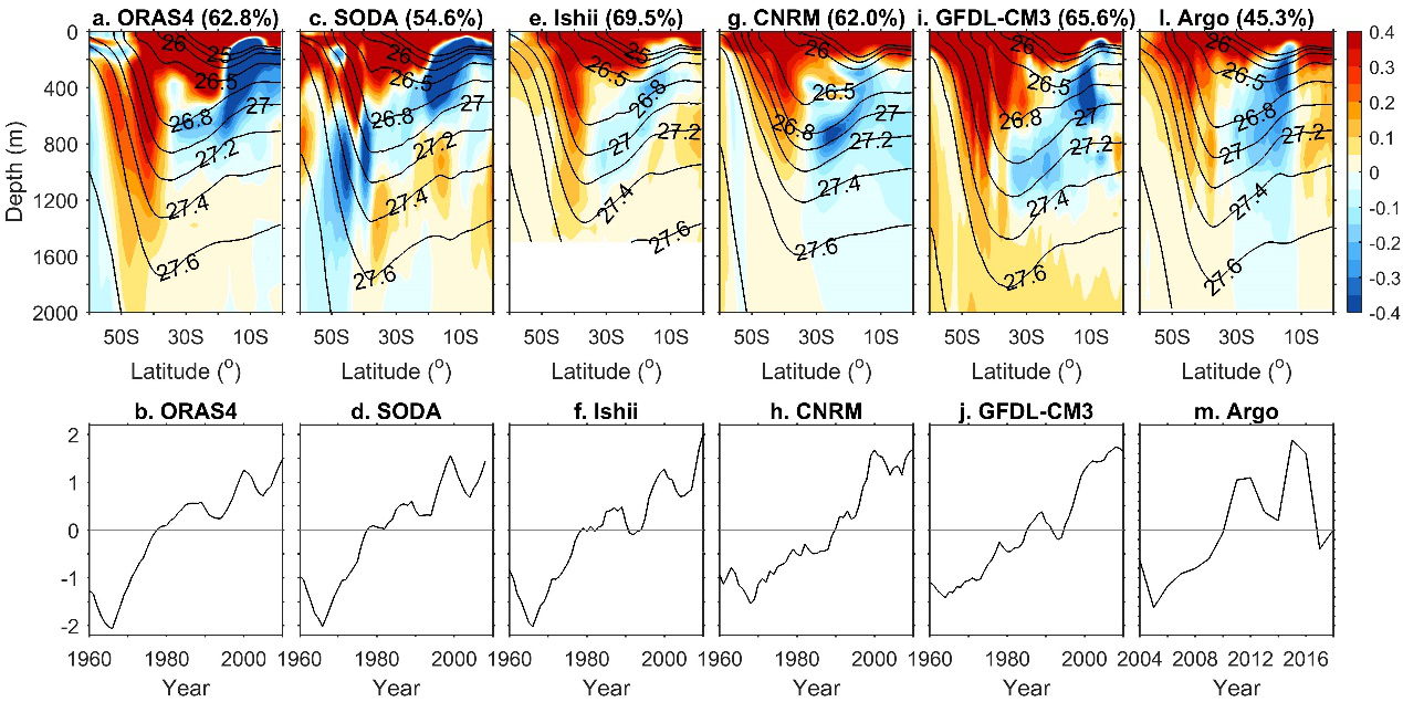 我院物理海洋学团队基于一系列再分析资料、模式输出和观测资料,发现南大洋正在经历的显著增暖可通过两种途径影响南印度洋次表层海水的热量再分配过程。首先,南大洋海表净热通量的增加导致了表层海水的增暖和局地更为深厚的对流层,通过抑制热带外大气的斜压不稳定迫使Hadley环流下沉支/西风带南移,进而在风应力旋度的驱动下整个副热带环流圈向极地偏移(图2),这导致南印度洋海水在位势密度槽的向赤道一侧变冷,向极地一侧变暖,产生图1所示的时空分布。