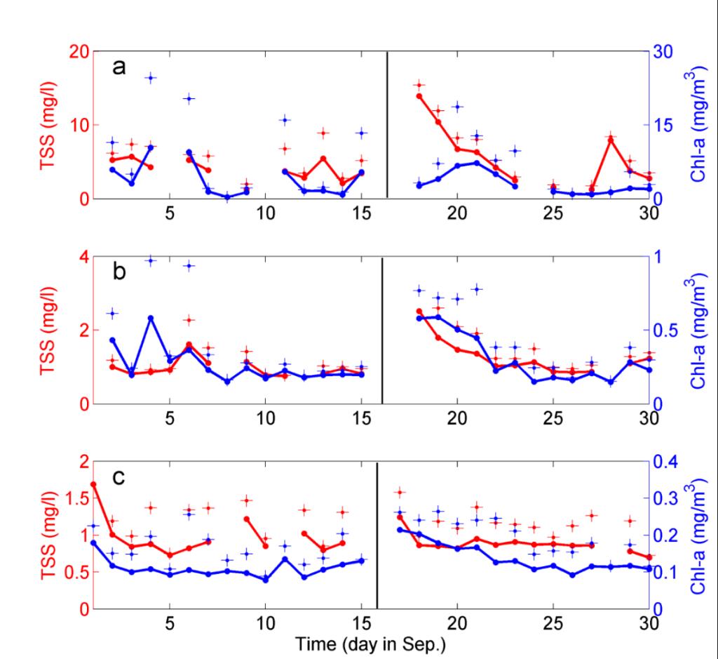 2. 近岸(a)、陆架b)及外海c)三个研究区域叶绿素a(蓝线)与悬浮物浓度(红线)的时间过程曲线。+代表叶绿素a和悬浮物浓度的标准差。黑色竖线代表台风过境时间