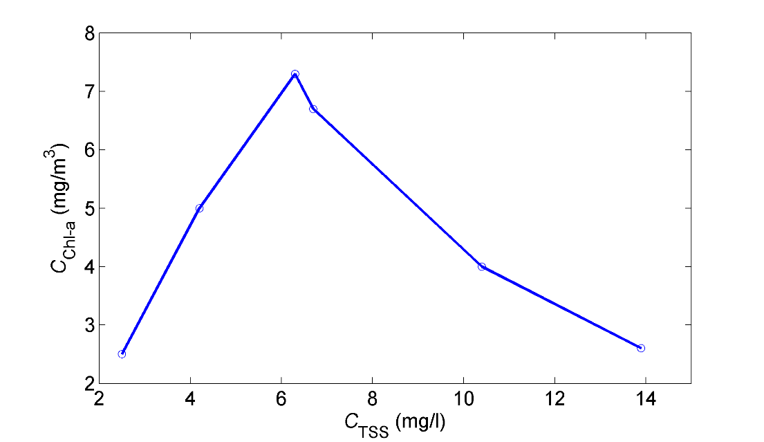 近岸、陆架及外海三个研究区域叶绿素a与悬浮物浓度时间过程曲线(图2)显示出三个区域叶绿素a与悬浮物浓度增加特征并不相同。近岸区域受径流影响悬浮物浓度增加明显,但是叶绿素a浓度的峰值悬浮物浓度延迟了5天。陆架区叶绿素a浓度与悬浮物浓度近似同步增加并且发现该区域叶绿素a浓度在悬浮物浓度为6 mg/l时达到最大(3)。外海区悬浮物浓度基本没有变化而叶绿素a浓度增加了一