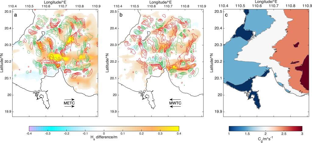 图2.(a)东向最大潮流的散度场(红色等值线标识辐聚,绿色等值线标记辐散)及其在琼州海峡东口处引发的有效波高变化(填色);(b)同(a),但为西向最大潮流作用下情形;(c)波浪群速度分布。注:(a)、(b)中有效波高变化在0.05m以内的区域未绘制。