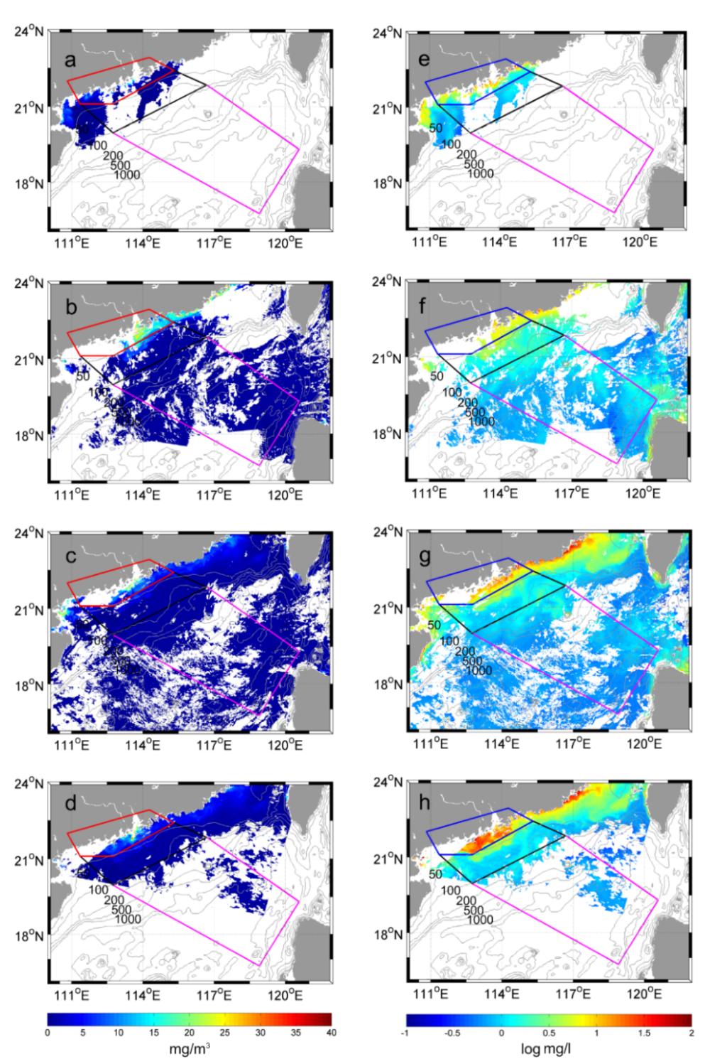 图1.悬浮物浓度(a-d)与叶绿素a浓度(e-h)在2018年9月15,18,20与21日的空间分布。颜色的框线划分出了近岸、陆架及外海三个研究区域。数值为等深线。