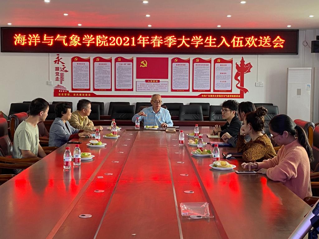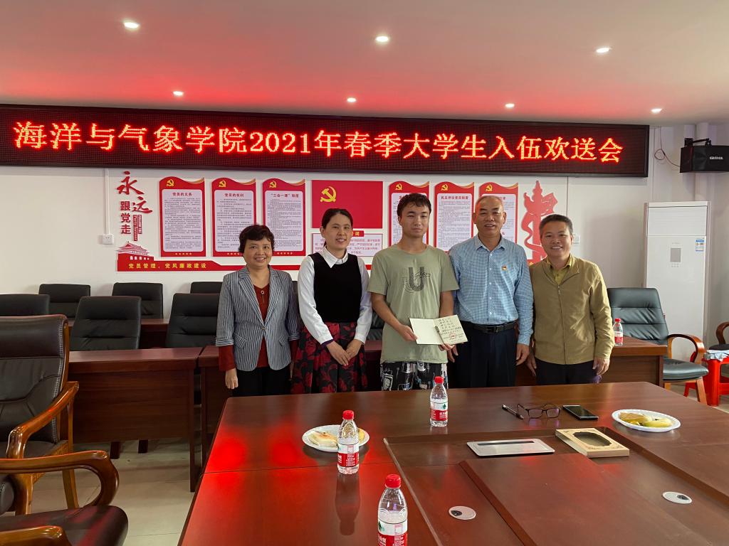在海科楼505会议室召开2021年春季大学生应征入伍欢送会,学院党委书记陈晓、院长谢玲玲、党委副书记刘宏英,学生处老师谢米希开买尔、陈莉,全体辅导员和应征入伍学生阿卜力克木·麦麦提敏参加了座谈会。