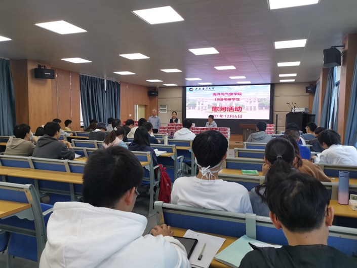 谢玲玲院长对同学们坚持不懈的奋斗状态表示肯定,表达了对同学们的殷切期望,同时指出在当今国家建设海洋强国的趋势下,同学们不仅要将考研与个人发展联系起来,还要与专业发展、国家发展联系起来,要好好学习,响应国家的号召。陈晓书记开导同学们考研无需太大压力,并相信大家都准备得很充分。刘宏英书记最后送上学院对考研学生的关心和祝福,学院会尽力为考研同学营造良好的考研环境。钟艺晴老师就心态调整、学习方法、考研注意事项等对同学们进行了嘱托。