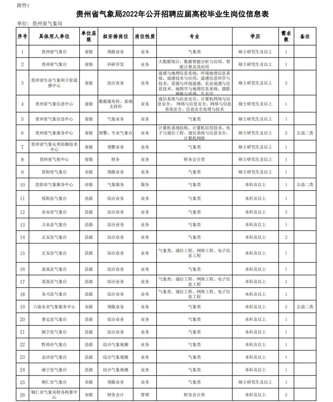 附件1:贵州省气象局2022年公开招聘应届高校毕业生岗位信息表