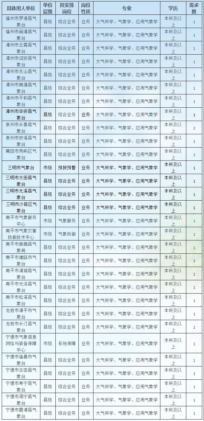 招聘信息在中国气象局网站(www.cma.gov.cn)、气象人才招聘网(zp.cmatec.cn)和福建省气象局网站(fj.cma.gov.cn)公开发布。