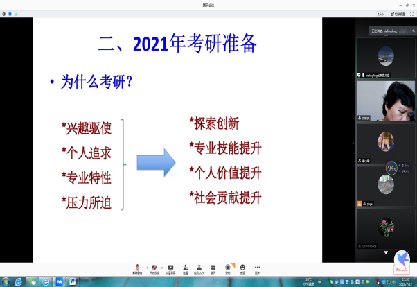 在腾讯会议室召开2020年考研总结表彰暨2021年考研动员大会。参加会议的有学院领导、各系的正副主任、全体班主任、全体辅导员以及2017级、2018级、2019级有考研意向的同学和2020届考研录取的同学,参会人员250多人。会议由学院党委副书记刘宏英主持。