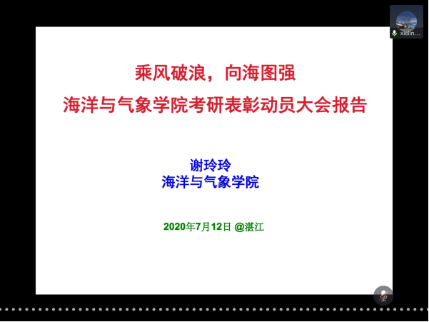 考研优秀学生代表海气1164班刘晶立同学和海科1161班薛宇璇同学介绍了考研经验,考研优秀指导老师代表周凤霞老师作指导考研经验交流发言,大气科学系系主任范伶俐、海洋科学系系主任侯庆华、副处级辅导员林海峰等老师对同学们考研作了指导发言。