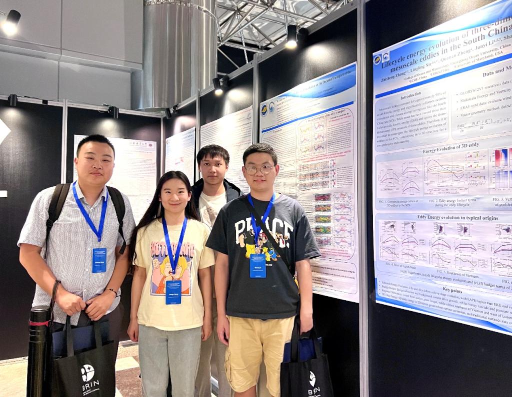 会议期间,张智晟同学代表导师谢玲玲教授在海洋与气候观测预测及服务分论坛做了题为"Seasonal reversal of mesoscale eddy polarities in marginal seas of the West Pacific"的口头报告。张智晟、李闯、郑宸宇、游济铭等同学分别以"Lifecycle energy evolution of three-dimensional mesoscale eddies in the South China Sea"、"Modulation of the Pacific Decadal Oscillation on the Decadal Transport of the Antarctic Circumpolar Current"、"Interannual variability of the East African Coastal Current associated with El Niño-Southern Oscillation"、"Mechanism of interseasonal Oscillation in Equatorial Surface Currents in the Pacific Ocean identified by Neural Network Models"为题进行了海报展示,就西太平洋边缘海中尺度涡极性的季节性反转、南海三维中尺度涡的生命周期能量演变、太平洋年代际振荡对南极绕极流输运的调制作用、厄尔尼诺-南方涛动与东非沿岸流年际变化的关系、以及基于神经网络模型识别太平洋赤道表层流季节内振荡机制等研究成果与国内外学者进行了深入的学术交流。
