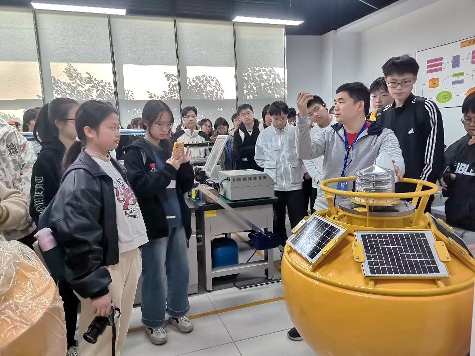 同学们接下来参观了广东海启星海洋科技有限公司,公司致力于推动新一代信息技术与海洋智能装备、海洋经济深度融合,打造标准化的产品研发和定制化服务体系。参观过程中,同学们在工程师的带领参观了公司展厅,工程师详细介绍了公司业务涉及到的重点技术,包括海洋动力灾害疏散路径智能规划系统、智慧渔业数字孪生平台等。同学们也参观了产品研发中心的一系列先进的海洋监测设备,主要包括分体式“永不沉没”浮标、自动气象观测系统、智能警戒潮位标识、新型验潮站、风暴潮监测站等。逼喱逼喱