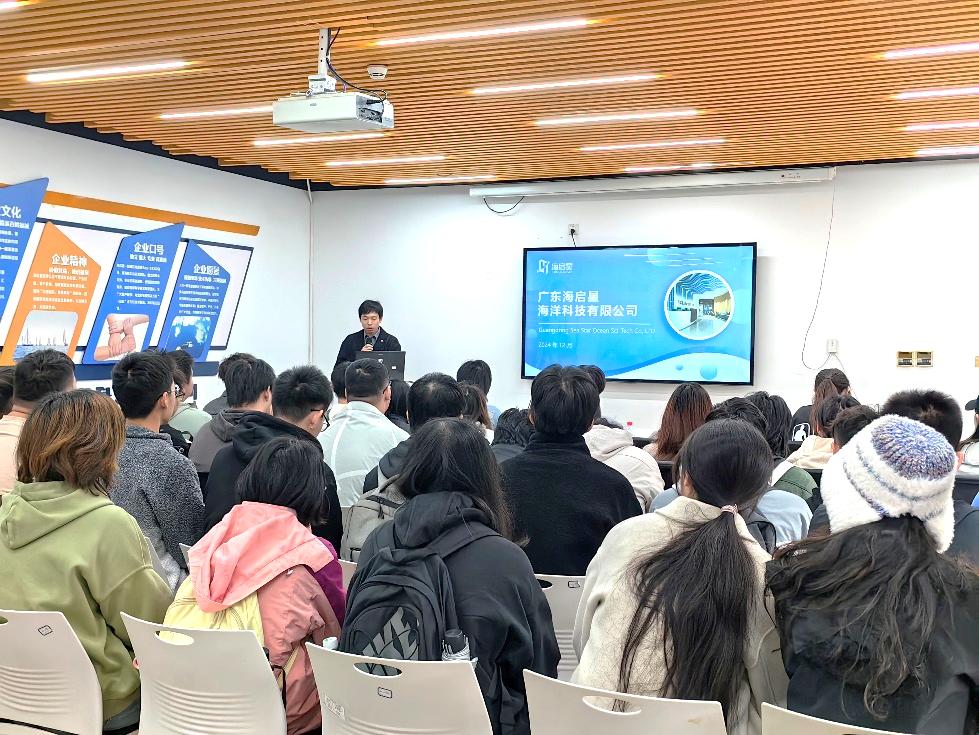 校友-公司技术副总工程师沈煜帆给同学们讲述了公司在海洋预警减灾、海洋生态环境保护、海洋观监测装备、海洋空间资源利用与保护等方面的重要成果,并与同学们就海洋科学专业学习心得和就业展开了热烈的讨论,极大的丰富了同学们对海洋科学实践应用的认识,同学们受益匪浅。