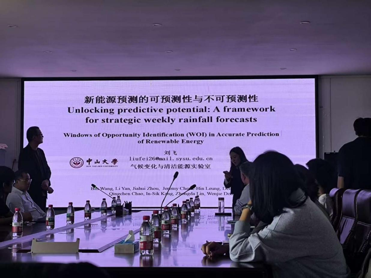 刘飞教授首先从新能源与石化能源的对比与互补关系切入,系统阐述了气象科学在新能源领域的应用价值,重点讲解了气象数据如何为能源系统稳定性提供保障,以及如何将预测产品应用于新能源技术的优化与服务。此外,他还结合近年来在气候变化与清洁能源方面的科普实践,分享了开展公众科学传播的经验与创新思路,为我院相关工作的推进提供了有益参考。