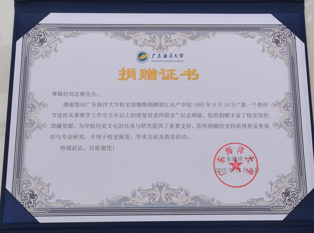 校史馆捐赠了一件珍贵校史实物——湛江水产学院1985年首个教师节赠予唐堃贤老师的纪念牌匾。该牌匾历经四十年岁月,不仅记录了学校早期教师表彰的历史,也是校园文化传承的重要实物载体。