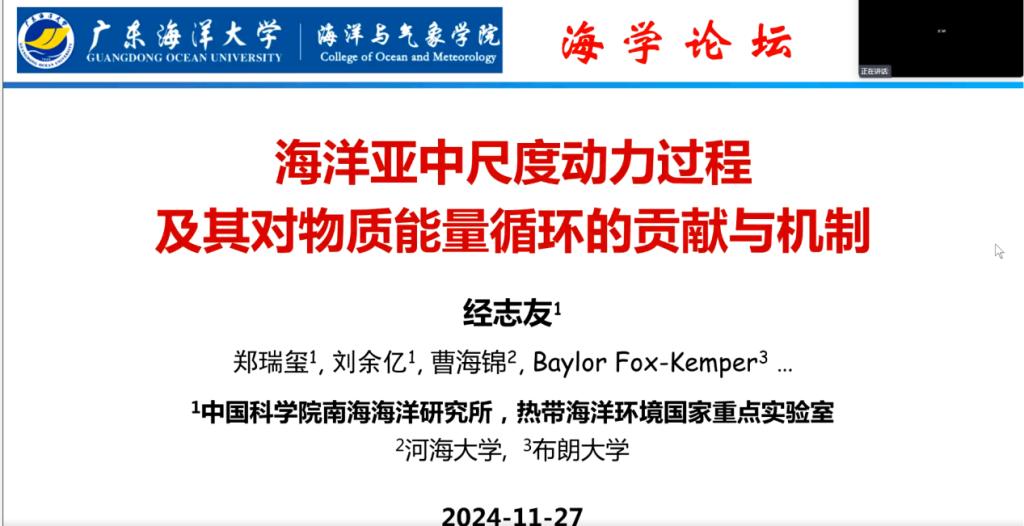 举行了2024年第18期海学论坛,本次论坛邀请到了中国科学院南海海洋研究所的经志友研究员,在线上作了题为《海洋亚中尺度动力过程及其对物质能量循环的贡献与机制》的学术报告。报告由谢玲玲院长主持。
