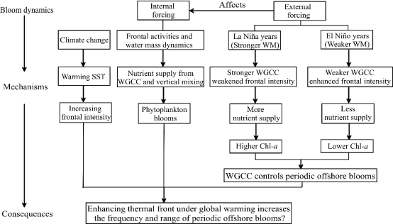 北部湾是位于南海西北部一个半封闭海湾,生产力较高,是我国重要的渔场和天然海水养殖基地。但令人惊讶的是,无论是基于现场调查还是卫星遥感图像均发现,北部湾中部(相对远离人类活动)在冬末春初时期频繁的出现藻华,甚至是赤潮,这是人为驱动因素难以解释的现象。针对上述问题,通过结合现场调查和卫星遥感长期数据(1981-2022)以及多个数据源,系统探究了气候变化下北部湾长时间尺度水动力变化及其对离岸周期性藻华的影响。北部湾的周期性离岸水华是由锋面活动和水团动力学(垂直混合和粤西沿岸流)的营养供应驱动的。在年际尺度上,受气候变化影响(SST升温),北部湾海洋锋面强度在过去40年显著增强。并且,拉尼娜年份的周期性近海水华明显强于厄尔尼诺年,因为在拉尼娜年,粤西沿海洋流更强,提供了更多的营养物质。这说明,北部湾离岸藻华的强度和范围与锋面强度无关,主要由内部强迫(锋面和粤西沿岸流的营养盐供应)直接驱动的,而内部强迫则是由外部强迫(ENSO活动)控制的。该研究