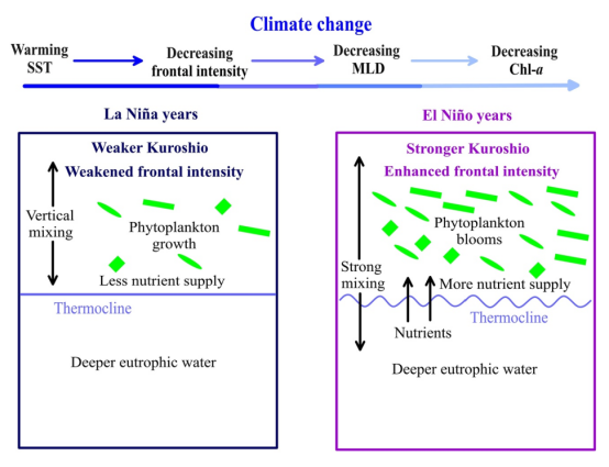 通过结合长期的卫星遥感数据(1981-2022年)和多种数据源,分析了在全球变暖的趋势下,吕宋海峡长期锋面活动及叶绿素浓度的变化,并讨论了锋面活动和叶绿素浓度对ENSO活动的响应。研究发现,冬季风期间,吕宋海峡均发现了强的锋面活动(锋面区域覆盖了超过60%)和高的叶绿素浓度。在厄尔尼诺年份,吕宋海峡冬季藻华强度增强,这是因为该时期更强的黑潮水入侵在吕宋海峡形成了更强的锋面活动,导致当地的垂直混合和上升流增强,从而向上层海洋输入更多的营养盐。但是,在年际尺度上,过去40年吕宋海峡的锋面强度和叶绿素浓度均呈现显著的下降趋势。这是因为在全球变暖下,南海水的升温比太平洋快,从而降低了南海水和入侵的黑潮水之间的温度差异,导致锋面活动减弱。海水变暖以及锋面活动的减弱导致吕宋海峡混合深度(MLD)降低至寡营养的上层水体,营养盐供应的限制阻碍了浮游植物的生长。该研究表明了边缘海的温度上升速度加快,降低了开阔大洋和边缘海之间的锋面强度和浮游植物生长(图1)。 该研究发表于《Journal of Geophysical Research: Biogeosciences》。