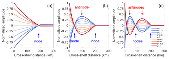 图3 12号轨道理想深度剖面前三个CSW模态(a-c)归一化振幅的跨陆架分布。渐变颜色曲线表示跨陆架方向的CSWs随时间变化的振幅