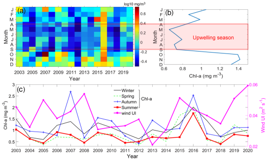 图5 (a)上升流区叶绿素a浓度的空间平均值、(b)叶绿素浓度气候态月平均值、(c)叶绿素a浓度和风应力引起的上升流指数(UI)季节平均的时间序列。红色阴影表示4—9月的上升流季节