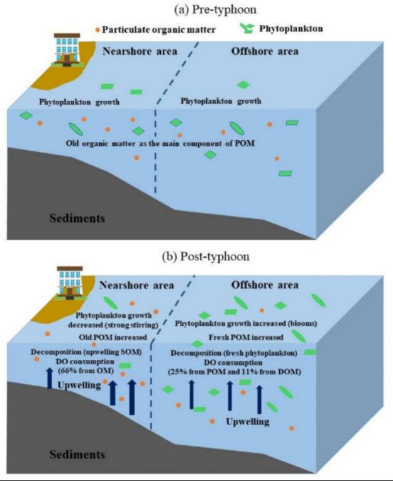我们此前通过现场调查发现,有机物的分解(碳源)是台风后沿海水域的主要过程,这与先前研究中的浮游植物生长(碳汇)相反。然而,台风诱导有机物分解的特征和机制以及分解主要分解颗粒有机物还是溶解有机物的问题仍不清楚。为了解决这些问题,对台风“Merbok”(2017)前后在南海北部进行物理化学参数和多种同位素的调查。台风过后,由于台风引起水体剧烈的扰动,近岸区域叶绿素a含量下降(25%),而上涌底部/沉积有机物(SOM)增加。相比之下,离岸的叶绿素a含量增加(增加了3倍),主要由于离岸区域水深,水体较为稳定。然而,然而,近岸和离岸都出现了正的表观耗氧量,这表明无论台风后是否出现浮游植物爆发,有机物的降解都是主要的生物地球化学过程。近岸区域分解的有机物主要来自SOM,而离岸主要来自原位新鲜的浮游植物。有机物的降解占近岸总耗氧量的66%,而在离岸占36%(主要是颗粒有机物为主,占25%)。本研究表明,台风引起的有机物降解可能以颗粒有机物为主,不利于有机物在沉积物中的储存。这意味着沉积物作为碳汇的能力将在全球变暖(台风事件增加)的情况下减弱。该研究发表于《Journal of