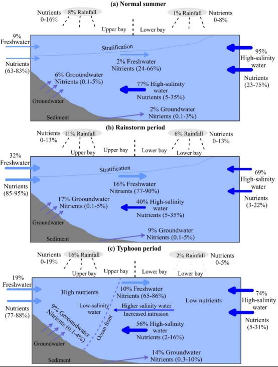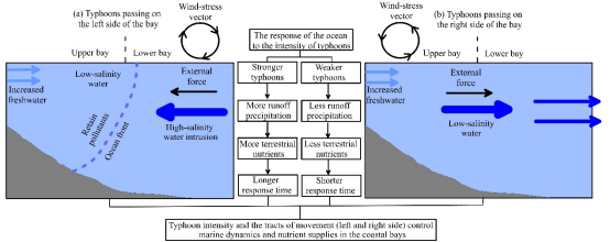 近岸海域是对台风响应最为剧烈的区域之一,也是受台风影响最为严重的区域之一。然而,由于有限的现场调查,尤其是现场的连续观测有限,我们对台风强度和移动路径对海洋动力学过程和生态环境因素的影响的理解仍然较少。为解决这一问题,本研对两个不同强度和登陆轨迹的台风(左侧和右侧)在湛江湾进行10个航次的双水同位素(δD和δ18O)进行连续调查(间隔5天)。台风过后,水团混合加剧并持续数周,持续的时间取决于台风的强度。在台风期间,淡水对湛江湾营养盐的贡献显著增加,并且,强台风的贡献高于弱台风。在湛江湾左侧登陆的较弱的台风Lionrock,由于期间形成的路向风,导致了大量高盐度海水入侵,形成了强的海洋锋面,并将大量陆源污染物滞留于湾内。然而,更强的台风Chaba在湛江湾右侧登陆,台风期间逆时针风应力引起的离岸风导致更多海水流向湾外流出,不能形成海洋锋面,稀释了湾内污染物。台风迁移路径直接影响了湾内海水动力方向,而台风强度提供了作用力。我们的研究表明,在台风事件期间,台风运动的轨迹,而不是其强度和陆地径流,在控制海洋动力学和沿海海湾的营养盐供应方面发挥着至关重要的作用。该研究发表于《Science of the Total Environment》。