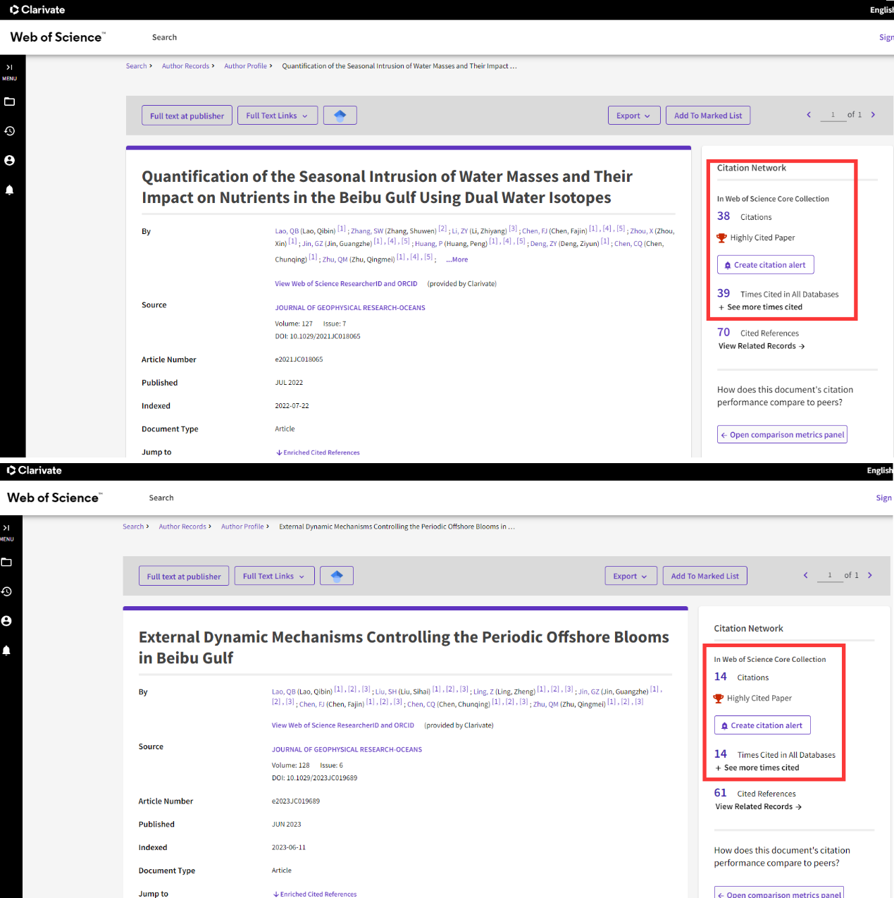 海洋科学学科2篇论文“Quantification of the seasonal intrusion of water masses and their impact on nutrients in the Beibu Gulf using dual water isotopes”(Lao et al., 2022, Journal of Geophysical Research: Oceans)和“External dynamic mechanisms controlling the periodic offshore blooms in Beibu Gulf”(Lao et al., 2023, Journal of Geophysical Research: Oceans)入选ESI全球前1%高被引论文(图1),实现逼喱逼喱