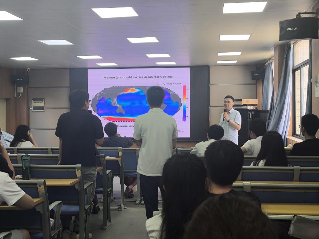 首先,赵宁教授系统介绍了放射性碳同位素的机理,并围绕测年原理与示踪方法两大主题进行讲解,特别是测年的海洋碳库效应与应用于大洋环流的研究案例;随后提出目前放射性碳同位素在应用于古海洋学研究中仍有许多挑战——碳库不确定性等因素,为未来更有效利用与优化放射性碳同位素技术提出了可能的解决途径。增长了师生对于放射性碳同位素前沿知识的了解。