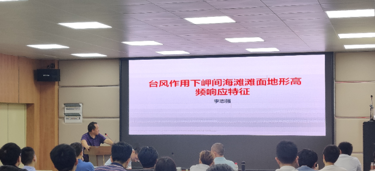 本次会议共组织了16场学术报告,其中6场为本校研究生所做报告。在报告开始之前,物理海洋、海洋气象、海洋化学和边缘海地质学各个学科方向均派代表老师在会上针对各自方向的近期研究作了简单汇报。学科方向汇报完成后,学术报告专场正式开始,李志强教授首先台为我们介绍了风作用下岬间海滩滩面地形高频响应特征,随后代替未能到场参会的张鹏老师作了题为“Long-term red tide outbreaks, nutrients pattern under the climate change and anthropogenic pressures in the Zhanjiang Bay, China”的学术报告。彭诗云、韩利国、罗亚飞、谢辉、李高聪、李敏、梁梅和李君益等多位老师都就各自领域的最新研究进展作了精彩纷呈的汇报。另外逼喱逼喱