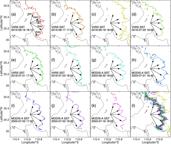 图1. 琼州海峡东口处上升流致冷水区西侧外缘线位置:(a)–(f)提取自VIIRS Level-2 SST数据;(g)–(k)基于MODIS Level-2 SST产品;(a)–(h)中冷水区外缘线的叠加展示于(l)。注:由于上升流在不同时间其强度动态变化,冷水区外缘线的提取基于不同温度值的等温线,(a)–(h)中所用等温线温度值依次为28.6, 28.5, 28.5, 28.5, 28.5, 28.3, 28.7, 27.5, 27.8, 27.2, 27.2 ℃。