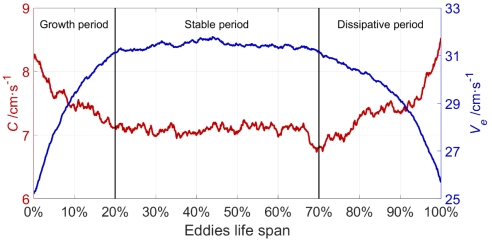 图1. 南海中尺度涡平均移速(红线)和转速(蓝线)在生命周期内的变化。