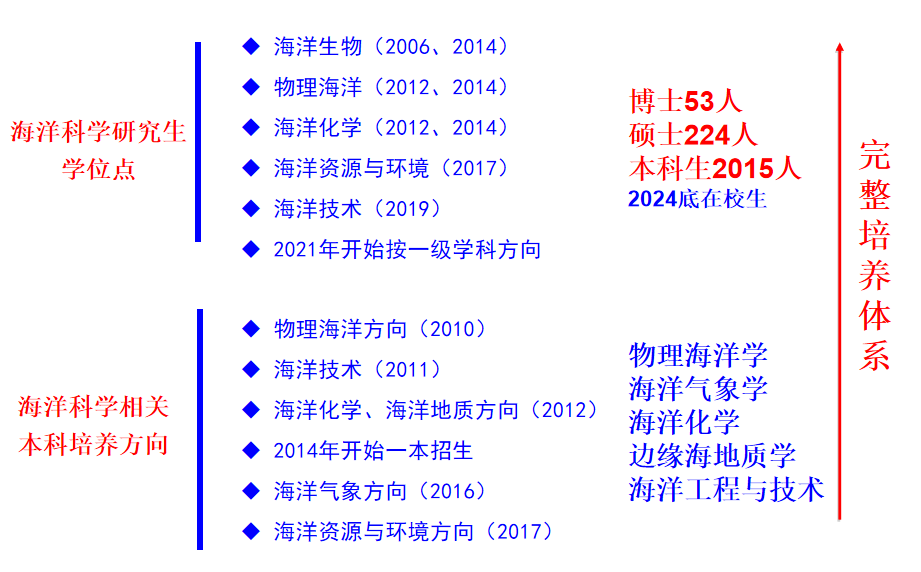 本学科设有物理海洋学、海洋气象学、海洋化学、海洋地质学、海洋技术等五个方向,重点开展海洋多尺度动力过程、海洋对气候变化响应、海洋遥感与数据分析;海-陆-气耦合机制、海气能量和水交换、海洋灾害数值模拟;海洋生物地球化学过程、海洋资源利用化学、海洋环境污染与生态修复;沉积有机质与油气资源、海岸地质与过程、海洋环境演化与古气候等十二个领域研究。